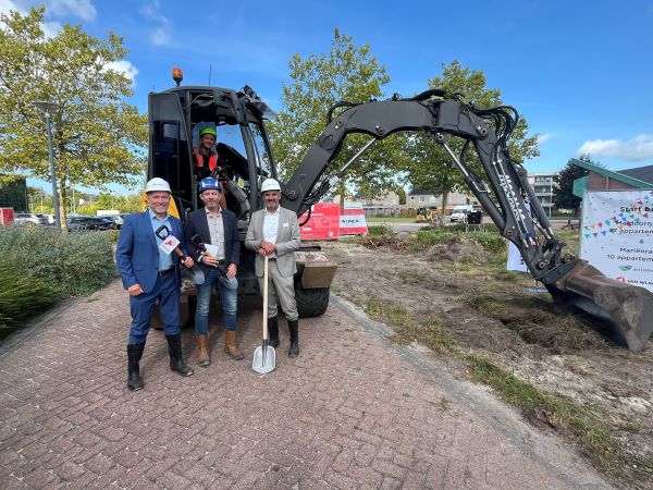 Deze maand is in Wezep de bouw gestart van twee nieuwe woongebouwen. Met een graafmachine werd symbolisch de eerste hap grond weggehaald. |